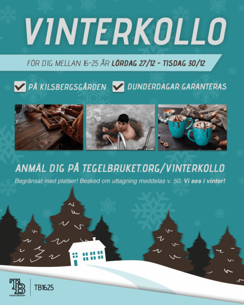Tegelbruket presenterar, för fjärde året i rad, VINTERKOLLO! För dig mellan 16-25 år som redan har eller köper ett TB-kort. Under några dagar på jullovet finns nu chansen att delta på kollo – fulla med kompishäng, aktiviteter och chill tillsammans med sköna ledare. Vi hoppas att du vill vara med och uppleva detta tillsammans med oss!