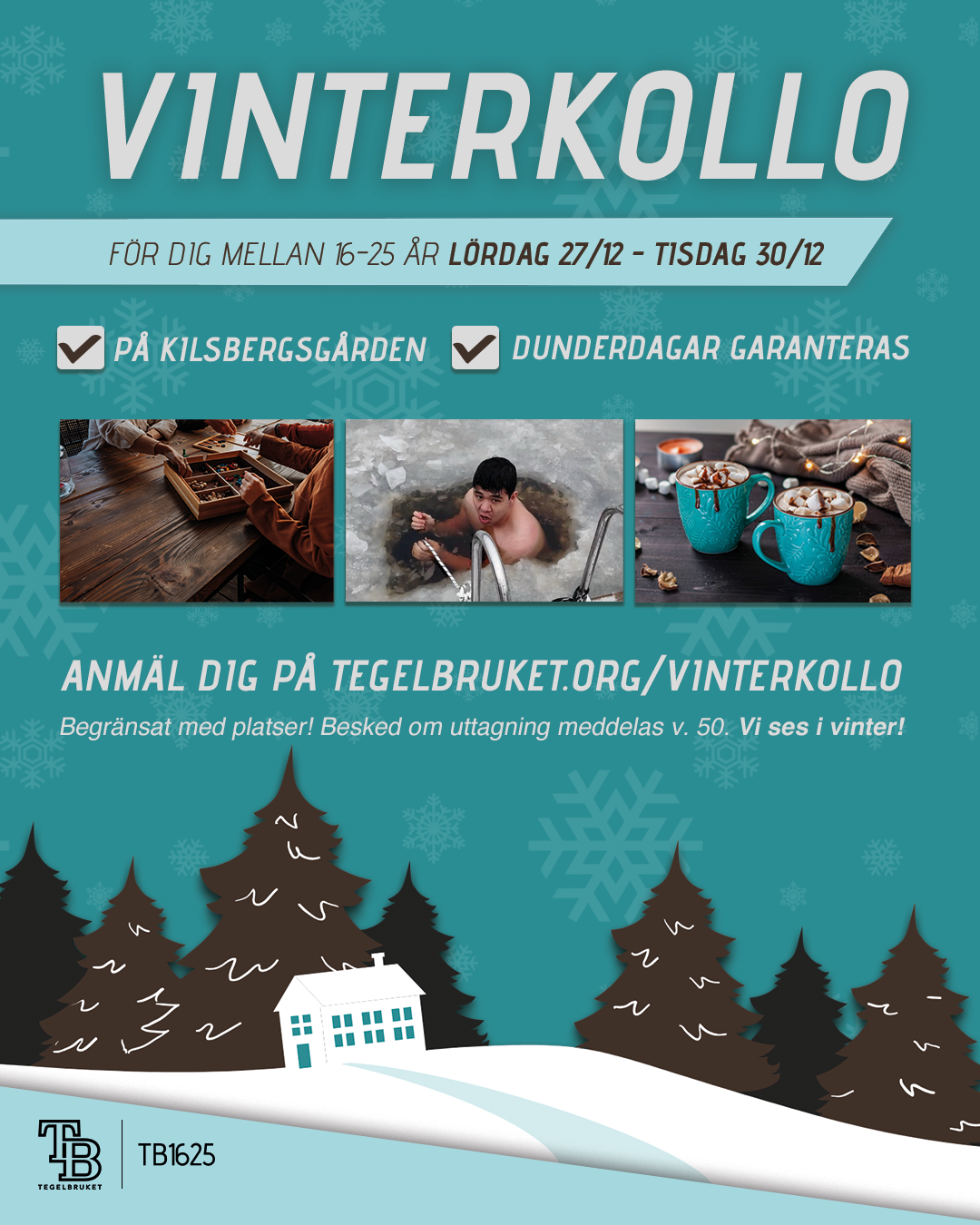 Tegelbruket presenterar, för fjärde året i rad, VINTERKOLLO! För dig mellan 16-25 år som redan har eller köper ett TB-kort. Under några dagar på jullovet finns nu chansen att delta på kollo – fulla med kompishäng, aktiviteter och chill tillsammans med sköna ledare. Vi hoppas att du vill vara med och uppleva detta tillsammans med oss!